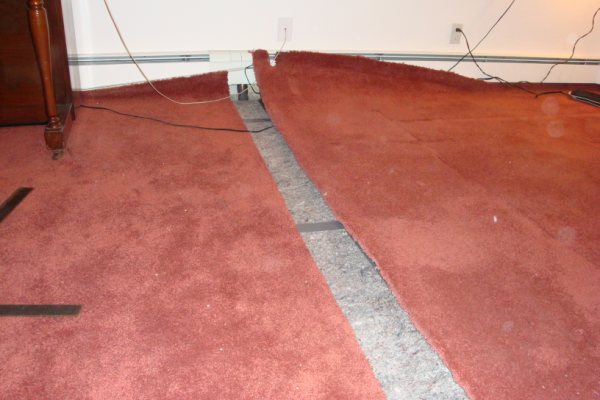 Here a wall has been removed during remodeling; we were able to reseam the carpet, making one room of seamless carpet. |